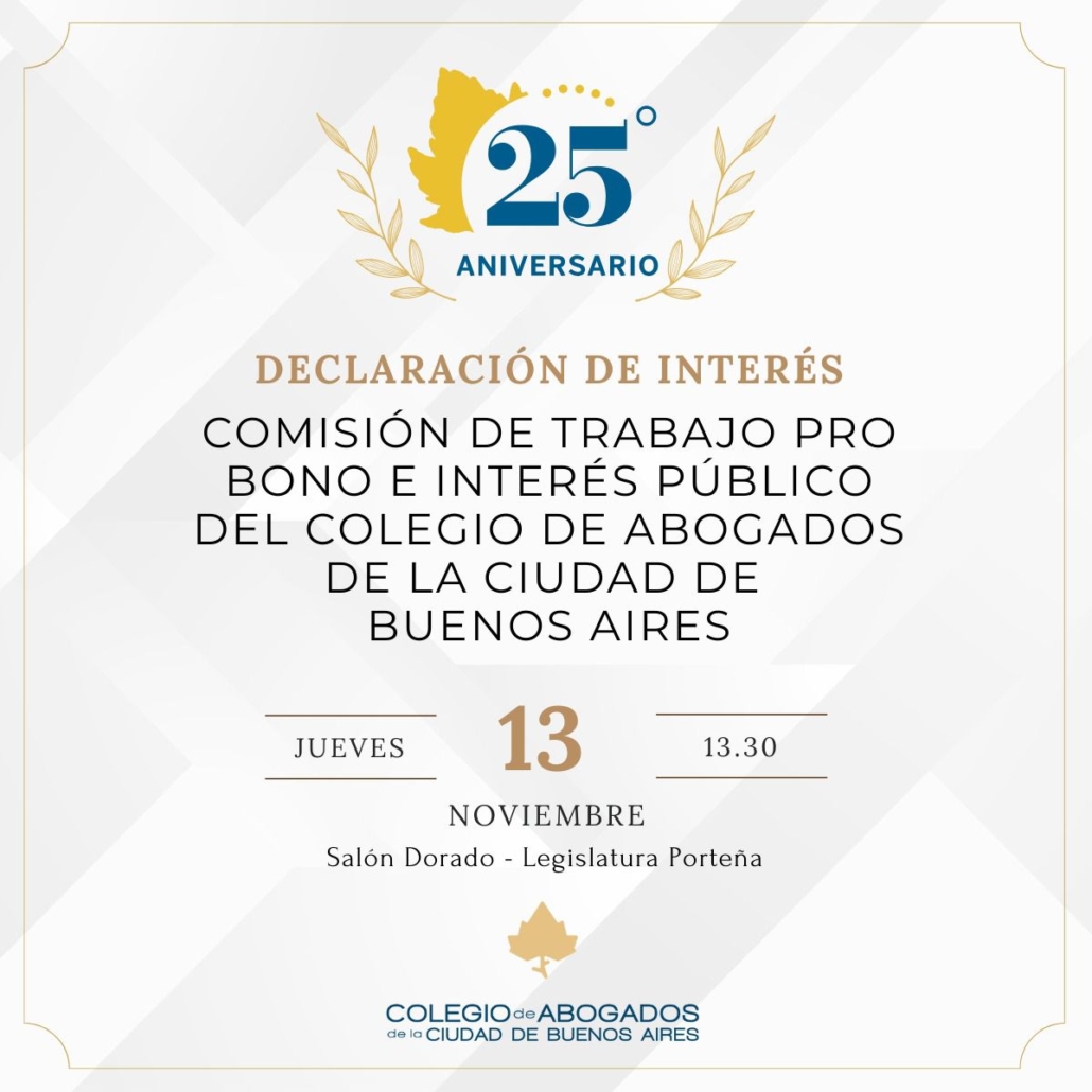 La Legislatura de la Ciudad Autónoma de Buenos Aires declarará de interés a la Comisión de Trabajo Pro Bono e Interés Público del Colegio de Abogados de la Ciudad de Buenos Aires, en reconocimiento a sus 25 años de trayectoria promoviendo el acceso a la justicia y la cultura pro bono en nuestro país.
